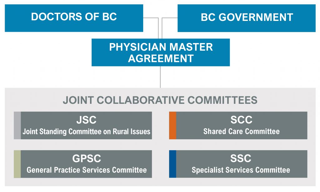 The four JCCs are: Family Practice Services Committee (FPSC), Specialist Services Committee (SSC), Shared Care Committee (SCC) and the Joint Standing Committee on Rural Issues (JSC)— were created to support this shared goal, with funds allocated to the committees from the Physician Master Agreement (PMA) — an agreement negotiated between Doctors of BC and the BC government.